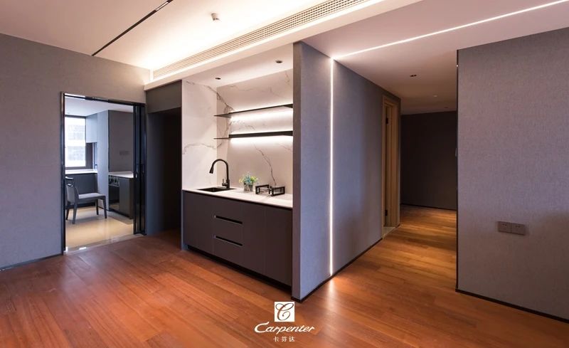 →全屋燈光設(shè)計,無主燈設(shè)計,線型燈點綴墻面、吊頂,營造柔和、均勻的溫馨氛圍。