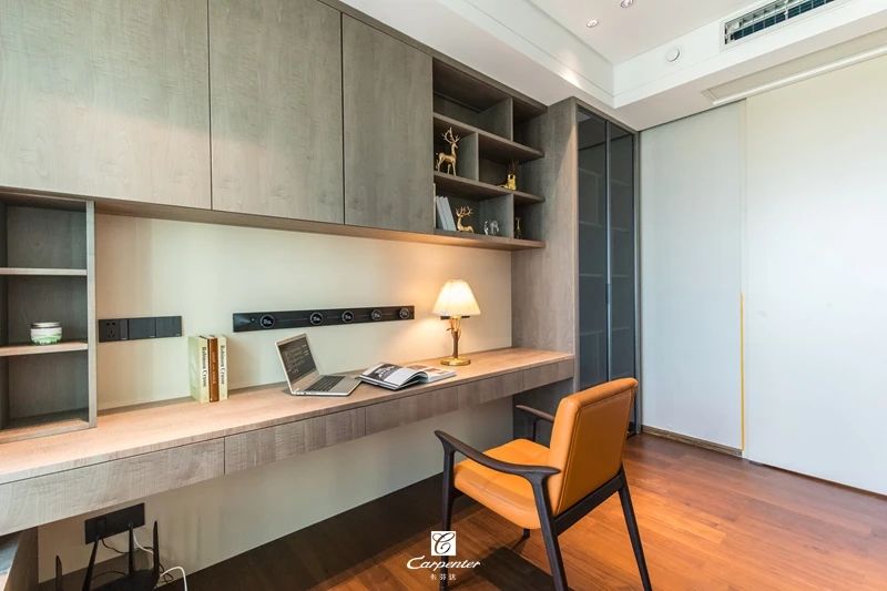 懸空一體超長(zhǎng)書(shū)桌+定制滿墻書(shū)柜